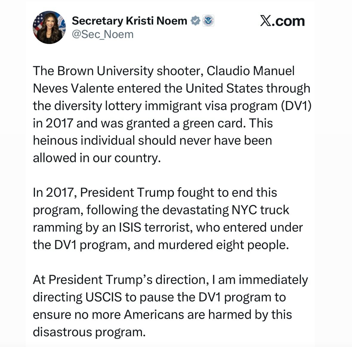 Trump suspends U.S. green card lottery after Brown University shooting (CNBC)
