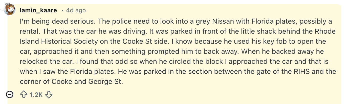 Days after the Brown shooting, police received an anonymous tip directing them to a Reddit post that warned authorities to look into a gray Nissan with Florida plates, possibly a rental. The Reddit user said he had a strange and concerning encounter with Neves-Valente inside a bathroom on the ground floor of Brown’s Barus and Holley building, where the shooting happened. After the post, the author spoke to police directly.